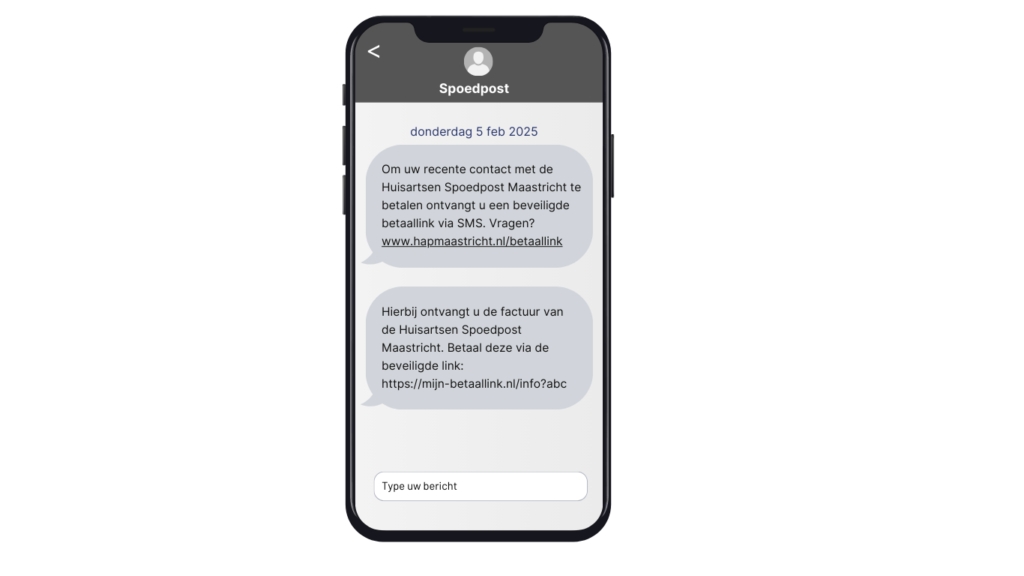 Als wij de kosten van uw contact aan de Huisartsen Spoedpost niet rechtstreeks bij uw verzekeraar kunnen declareren, sturen wij u een betaalverzoek per SMS. Deze SMS bevat een link naar een vertrouwde betaalomgeving van Sendi. Dit maakt het betalen eenvoudig en veilig via uw mobiele telefoon.